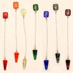 This set of seven chakra pendulums were custom designed in the Czech Republic, to include the oft-missing indigo!  Crafted of stained glass in a small village in Bohemia, they feature spirals of pure silver, except for the orange which is highlighted inside with gold.  $80 for 7 pendulums, $12 each