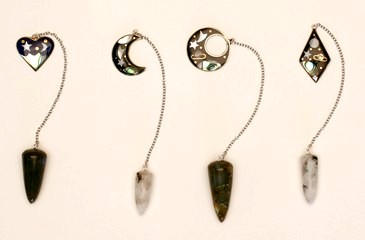 These alpaca, abalone, and enamel celestial pieces are crafted in the silver city of Taxco, Mexico, and paired with rainbow moonstone, labradorite, lapis, and dark green adventurine. $22